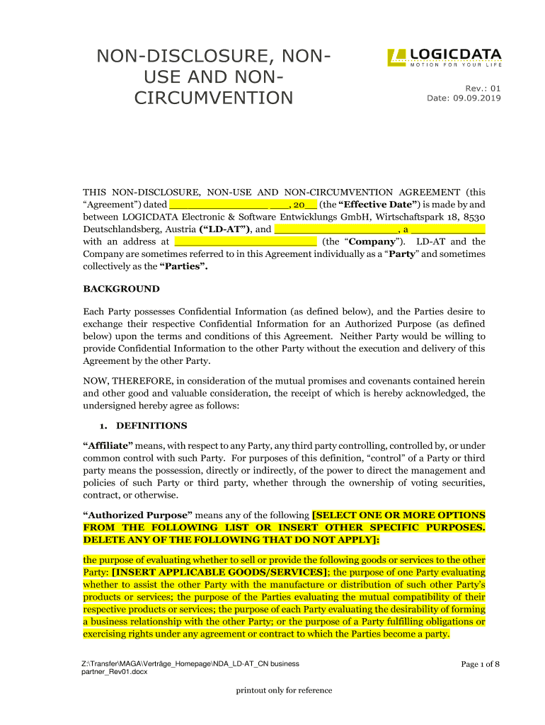 NONDISCLOSURE, NONUSER AND CIRCUMVENTION AGREEMENT Rev.: 01 Date: 09.09.2019THIS NONDISCLOSURE, NONUSER AND CIRCUMVENTION AGREEMENT (this Agreement) dated, 20 (the Effective Date) is made by and between