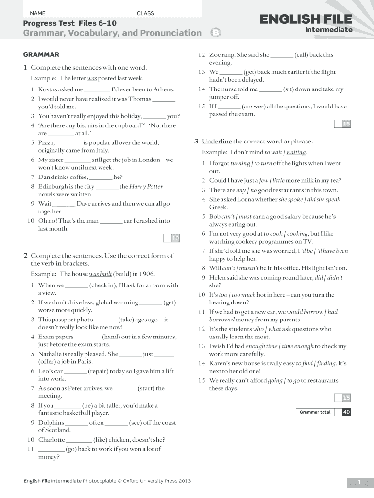 NAME CLASSProgress Test Files 610Grammar, Vocabulary, and Pronunciation B GRAMMARENGLISH FILE Intermediate12Zoe rang. She said she (call) back this evening.1Complete the sentences with one word.13We