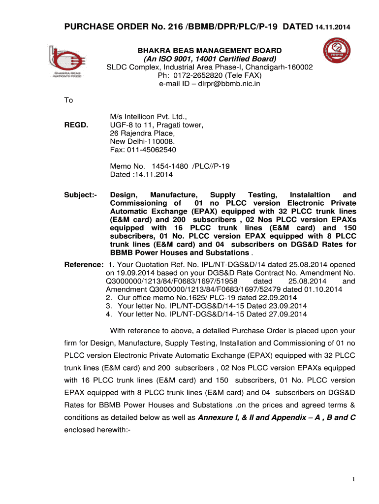 Get the free PURCHASE ORDER No. 216 /BBMB/DPR/PLC/P-19 DATED ... - 164 100 104