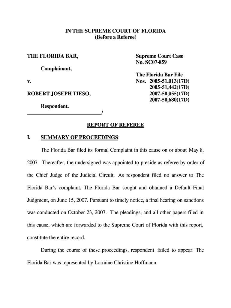 IN THE SUPREME COURT OF FLORIDA (Before a Referee)THE FLORIDA BAR, Supreme Court Case No. SC07859Complainant, v. ROBERT JOSEPH TIES, The Florida Bar File Nos. 200551,013(17D) 200551,442(17D) 200750,055(17D)