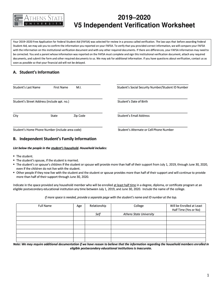 The 20192020 v5 independent verification is required by individuals who are applying for financial aid or scholarships for the 2019-2020 academic year.