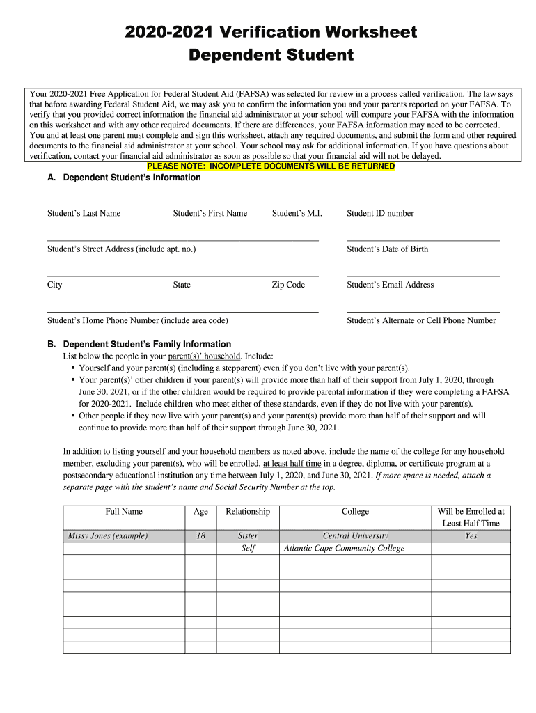 Get the free 2020-2021 DEPENDENT Verification Worksheet SECTION A ...