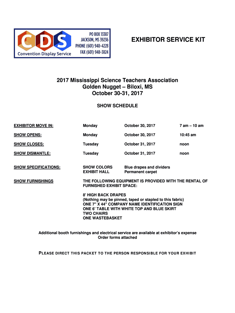 EXHIBITOR SERVICE KIT2017 Mississippi Science Teachers Association Golden Nugget Biloxi, MS October 3031, 2017 SHOW SCHEDULEEXHIBITOR MOVE IN:Monday, October 30, 20177 am 10 show OPENS:Monday, October