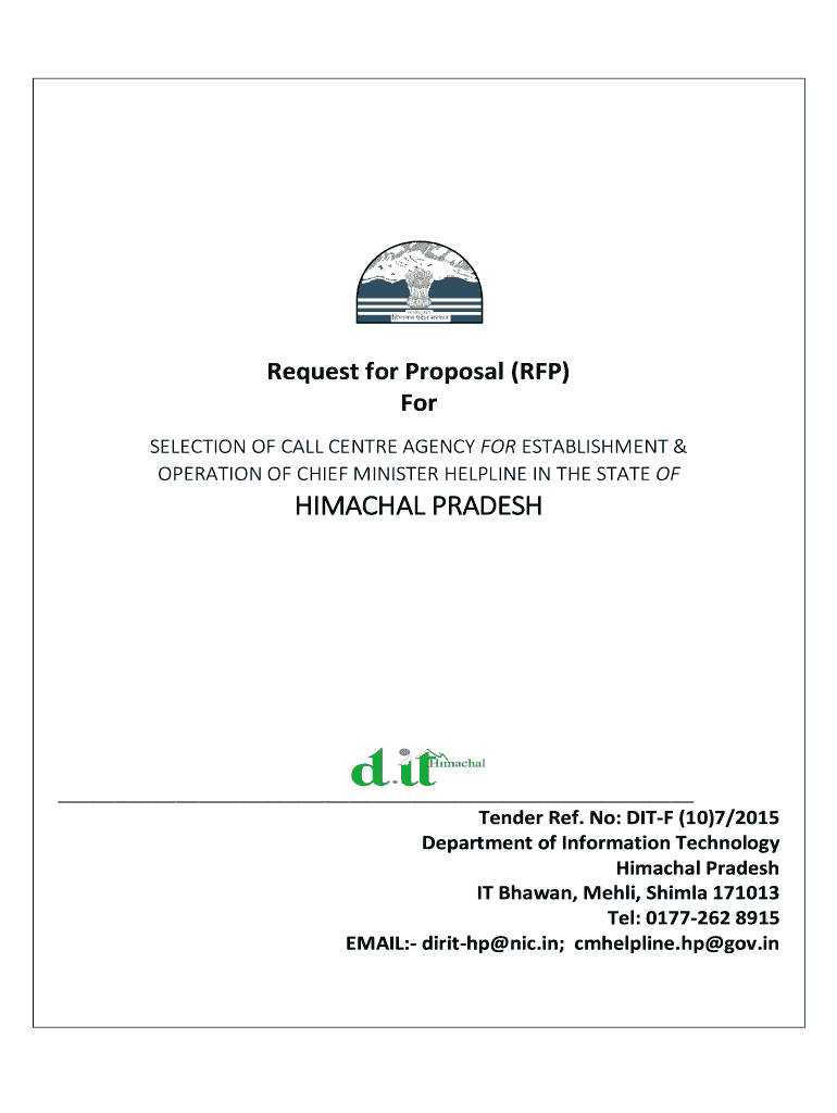 Request for Proposal (RFP) For SELECTION OF CALL Center AGENCY FOR ESTABLISHMENT & OPERATION OF CHIEF MINISTER HELPLINE IN THE STATE HIMACHAL PRADESH Tender Ref. No: ITF (10)7/2015 Department of Information
