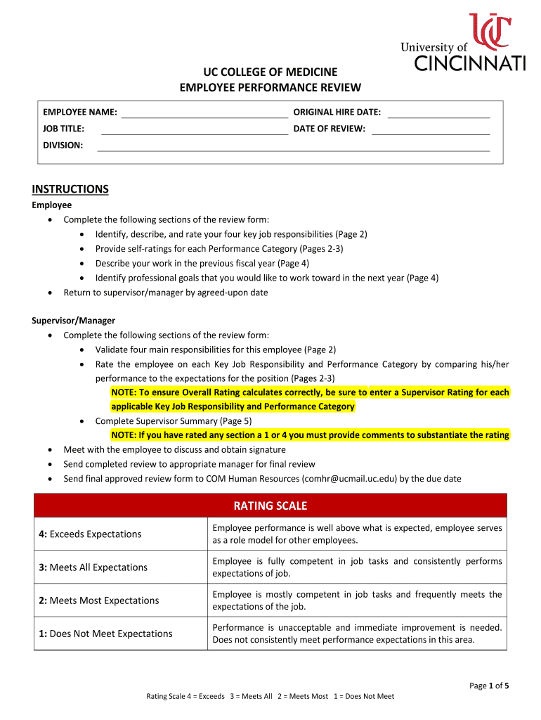 UC COLLEGE OF MEDICINE EMPLOYEE PERFORMANCE REVIEW EMPLOYEE NAME:ORIGINAL HIRE DATE:JOB TITLE:DATE OF REVIEW:DIVISION:INSTRUCTIONS Employee Complete the following sections of the review form: Identify,