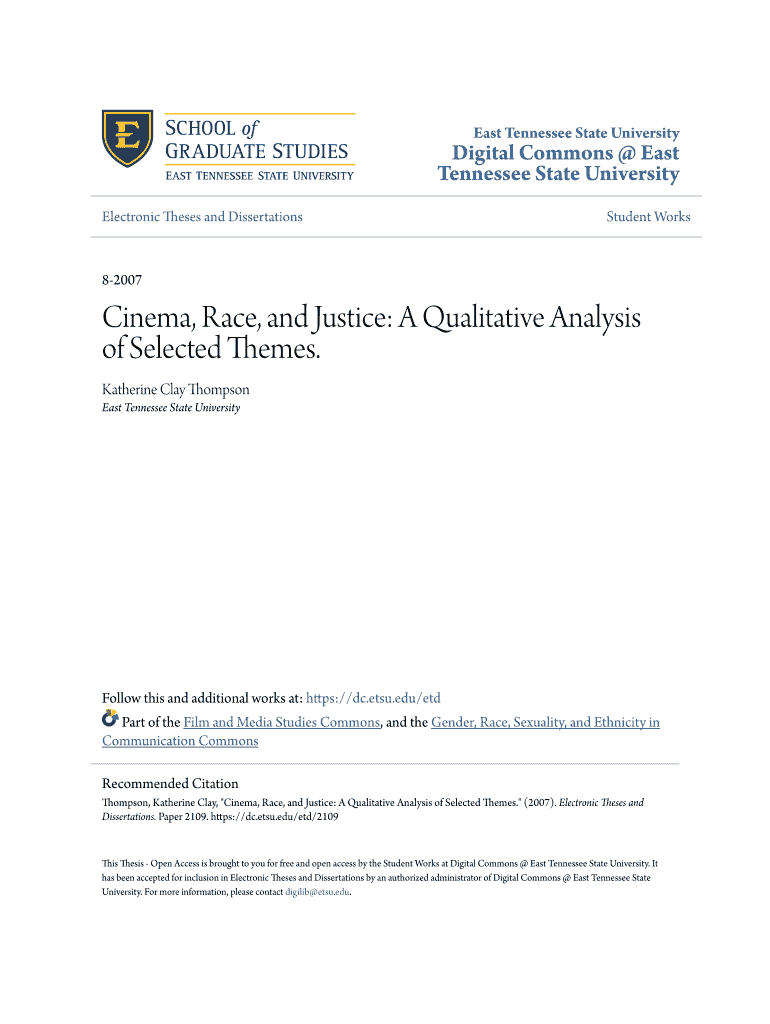 East Tennessee State UniversityDigital Commons East Tennessee State University Electronic Theses and DissertationsStudent Works82007Cinema, Race, and Justice: A Qualitative Analysis of Selected Themes.