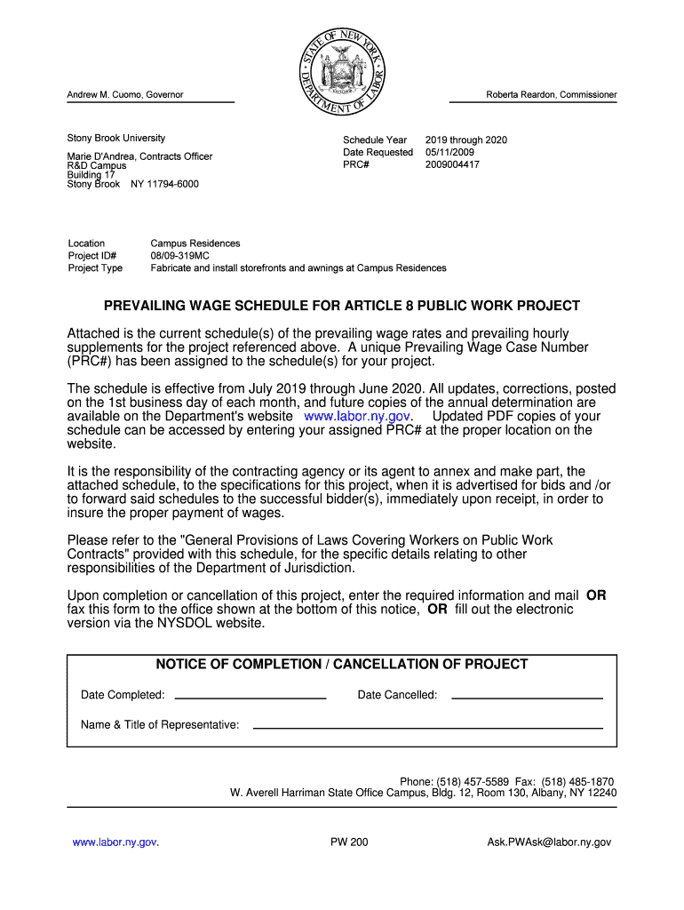 Andrew M. Cuomo, Governor Roberta Rear don, Commissioner Stony Brook UniversitySchedule Year Date Requested PRC#Marie D 'Andrea, Contracts Officer R&D Campus Building 17 Stony Brook NY 117946000Location