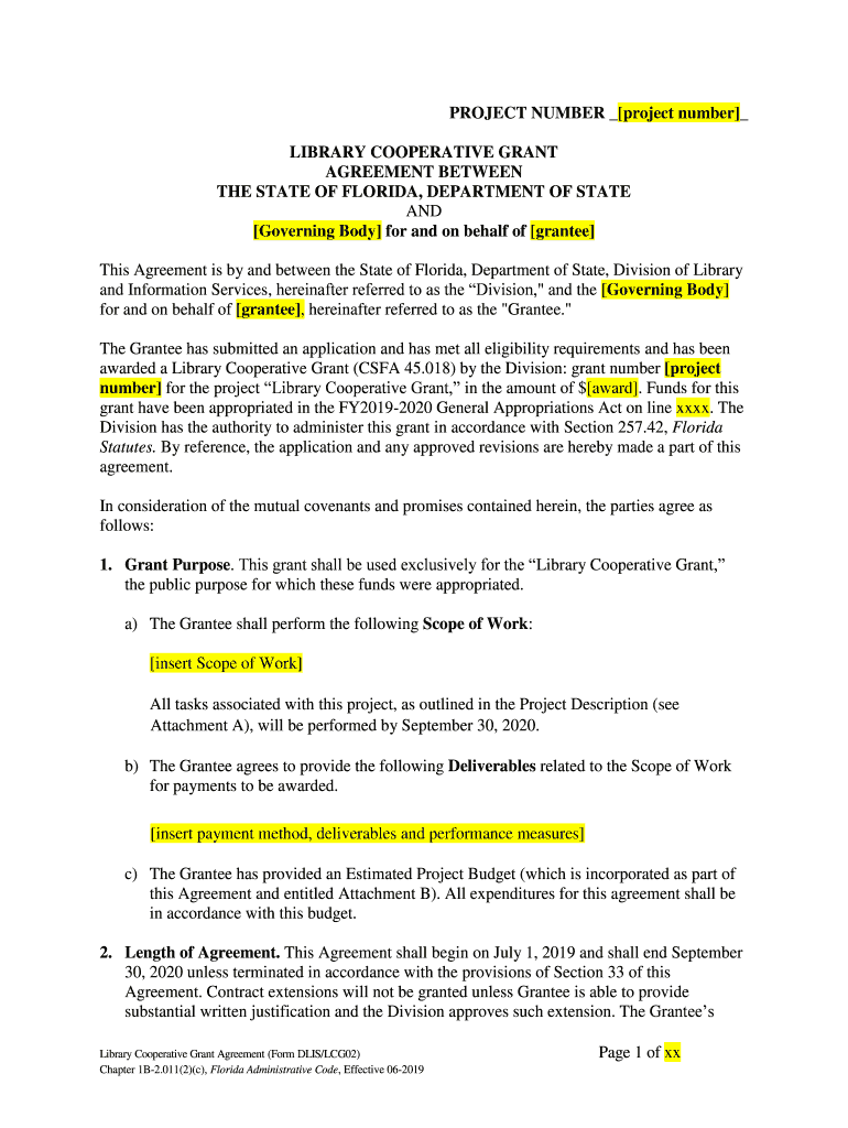 PROJECT NUMBER LIBRARY COOPERATIVE GRANT AGREEMENT BETWEEN THE STATE OF FLORIDA, DEPARTMENT OF STATE AND Governing Body for and on behalf of grantee This Agreement is by and between the State of Florida,