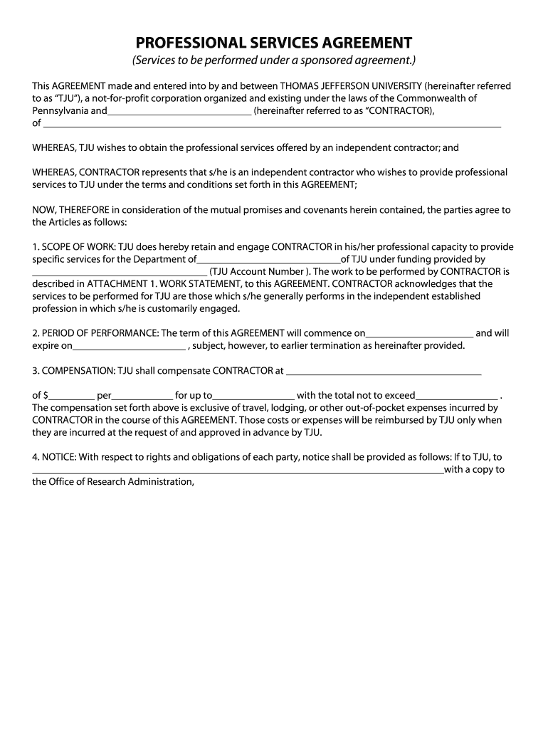 The Professional Services Agreement is a service agreement used by Thomas Jefferson University (TJU) to formally engage independent contractors for specific services.