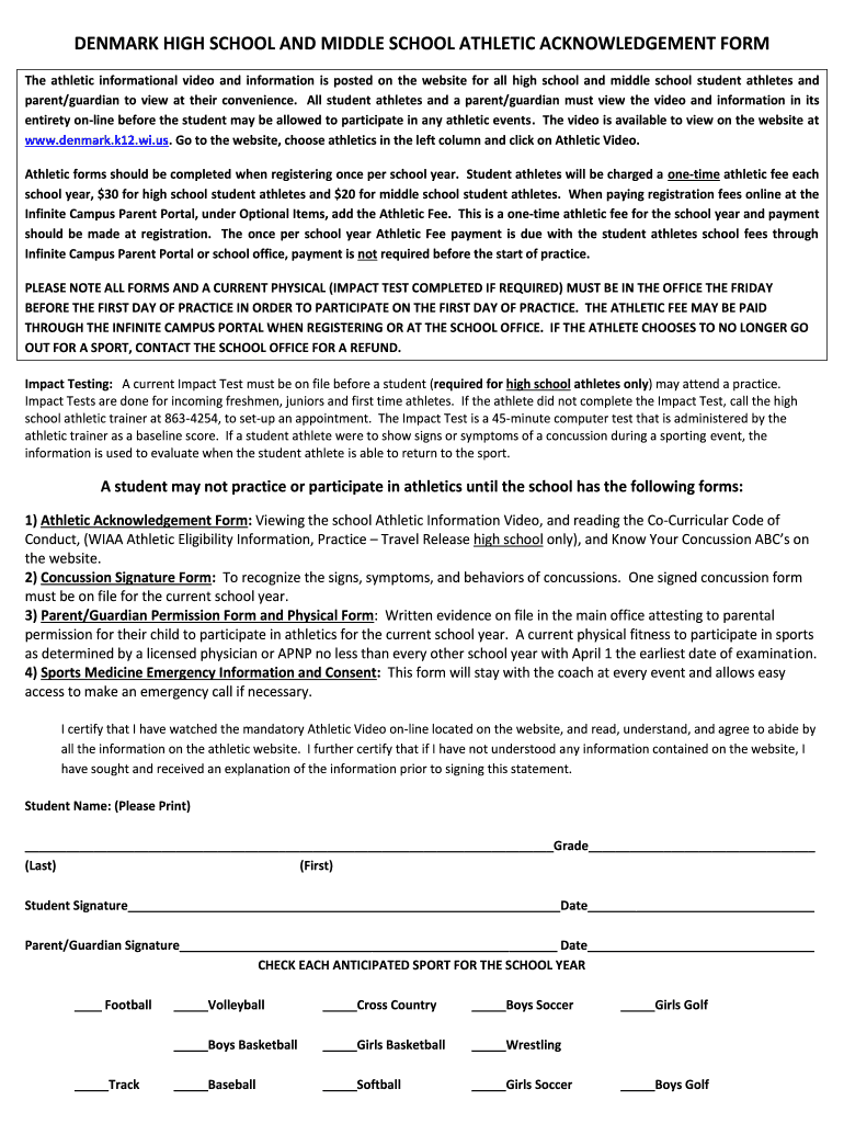 Get the free ATHLETIC ACKNOWLEDGEMENT FORM - Denmark School ...