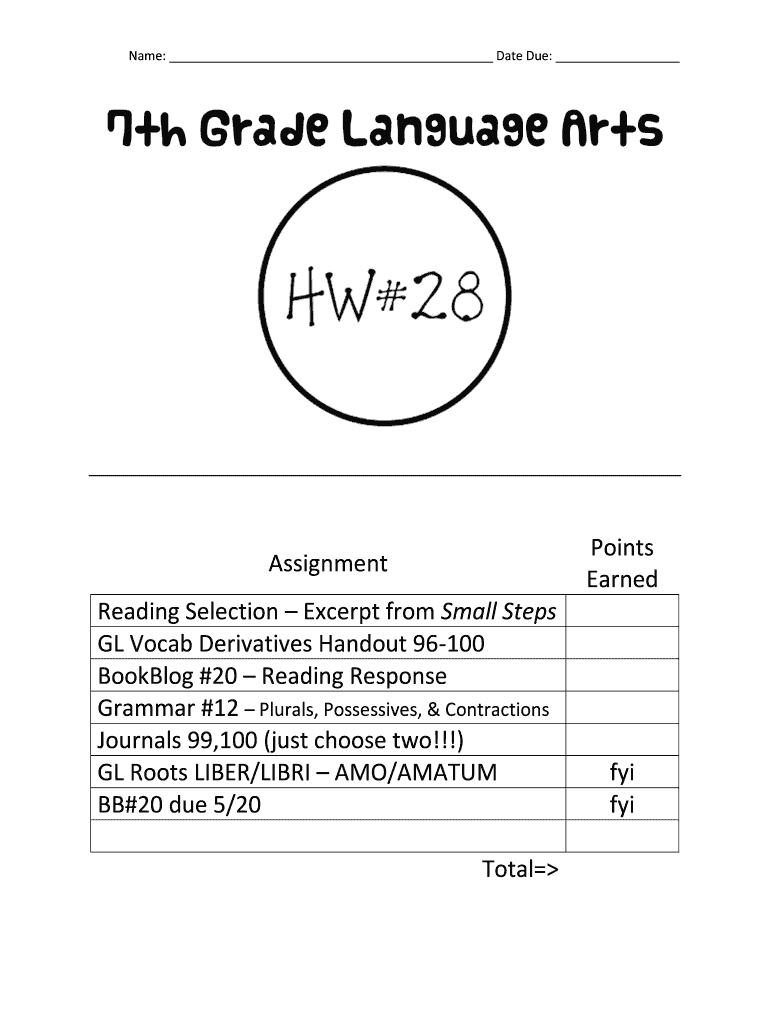 Name: Date Due: Points EarnedAssignment Reading Selection Excerpt from Small Steps GL Vocab Derivatives Handout 96100 Booking #20 Reading Response Grammar #12 Plurals, Possessives, & Contractions