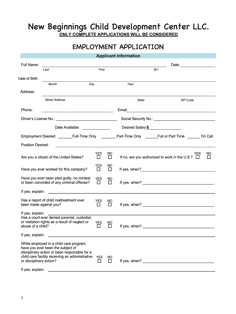 New Beginnings Child Development Center LLC. ONLY COMPLETE APPLICATIONS WILL BE CONSIDEREDEMPLOYMENT APPLICATION Applicant Information Full Name:Date: LastFirstM. I. Date of Birth: MonthDayYearAddress: