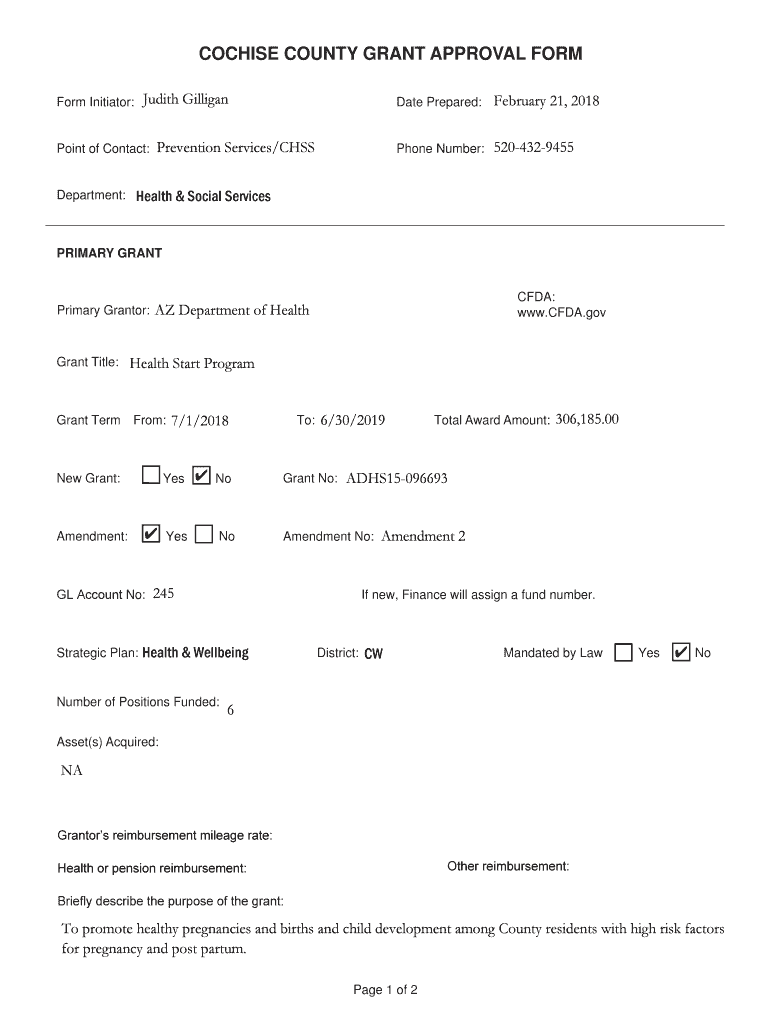 COCHISE COUNTY GRANT APPROVAL FORM Judith Gilligan Form Initiator: February 21, 2018, Date Prepared: Prevention Services/CHESS Point of Contact: 5204329455 Phone Number: Department:Health & Social