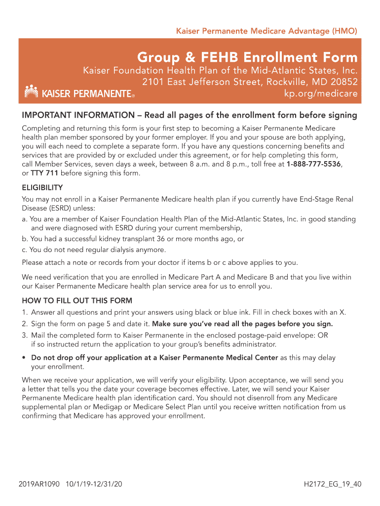 Kaiser Permanent Medicare Advantage (HMO)Group & FEB Enrollment Form Kaiser Foundation Health Plan of the mid-Atlantic States, Inc. 2101 East Jefferson Street, Rockville, MD 20852kp.org/medicare IMPORTANT