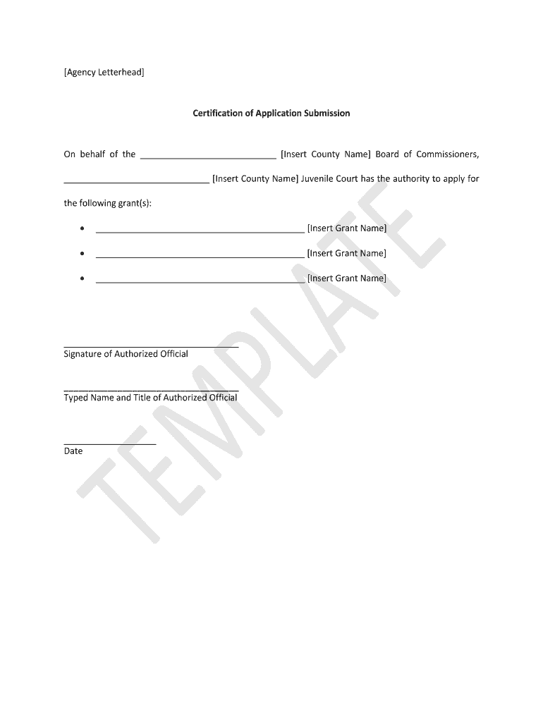 Agency Letterhead Certification of Application Submission behalf of the Insert County Name Board of Commissioners, Insert County Name Juvenile Court has the authority to apply for the following grant(s):
