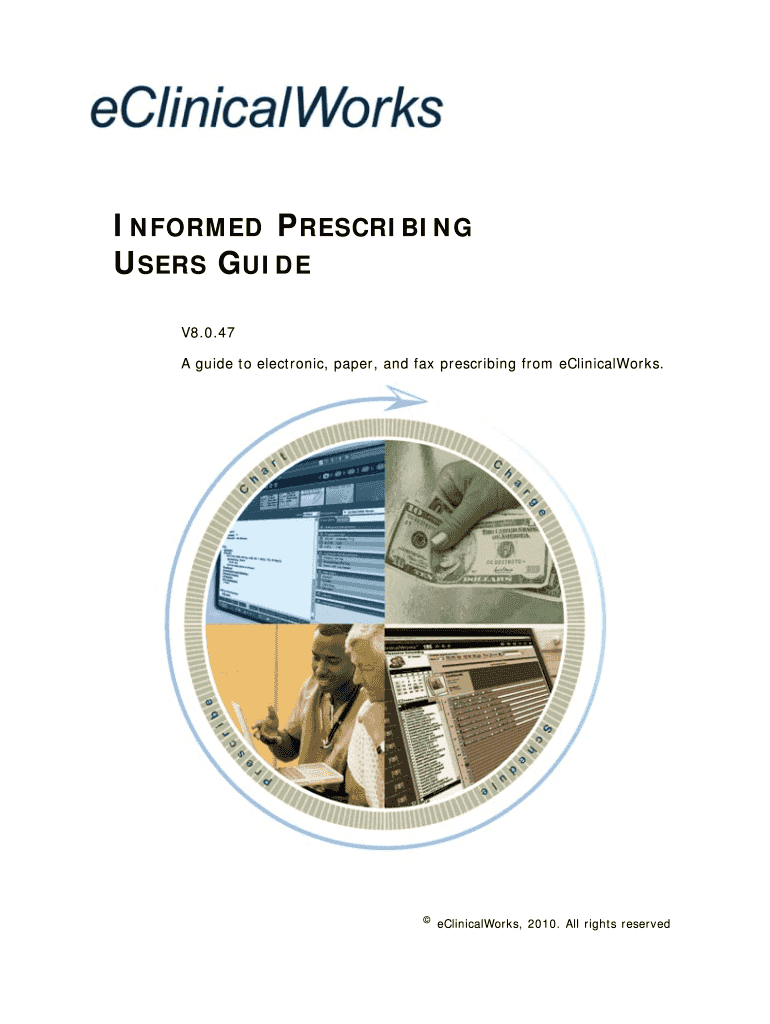 INFORMED PRESCRIBING USERS GUIDE V8.0.47 A guide to electronic, paper, and fax prescribing from eClinicalWorks.eClinicalWorks, 2010. All rights reservedCONTENTS ABOUT THIS GUIDE 6 Product Documentation