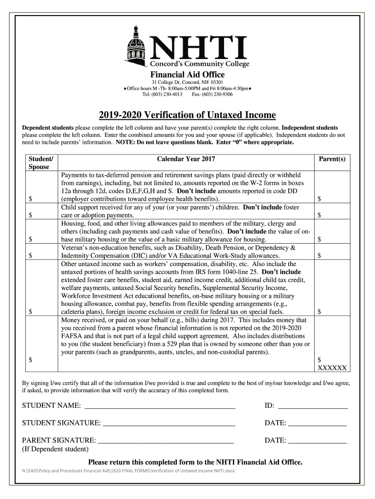 Fax: (603) 230930620192020 Verification of Untamed Income