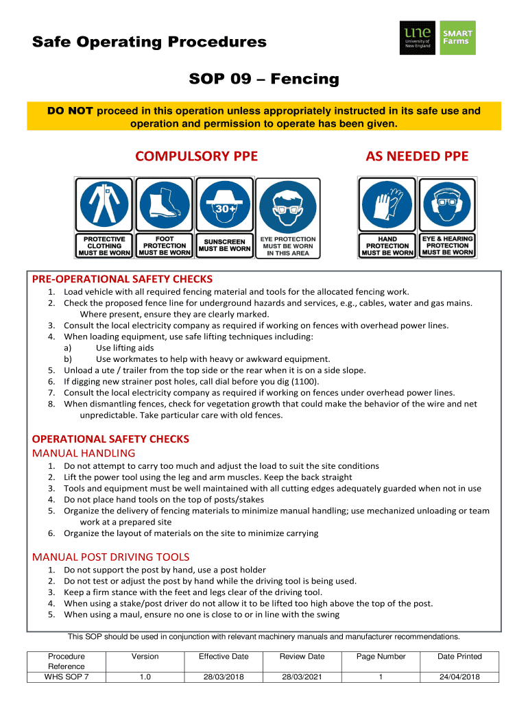 Safe Operating Procedures SOP 09 Fencing DO NOT proceed in this operation unless appropriately instructed in its safe use and operation and permission to operate has been given. COMPULSORY PEAS NEEDED