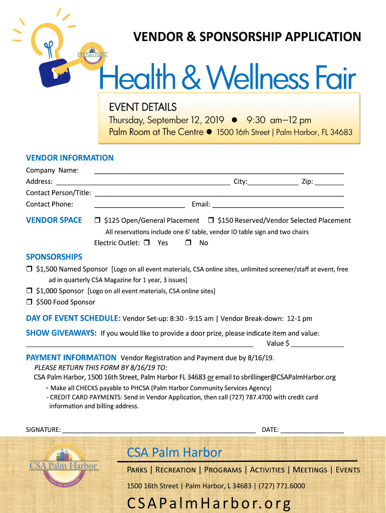 VENDOR & SPONSORSHIP APPLICATIONHealth & Wellness Fair EVENT DETAILS Thursday, September 12, 2019 9:30 am12 pm Palm Room at The Center 1500 16th Street Palm Harbor, FL 34683 VENDOR INFORMATION Company