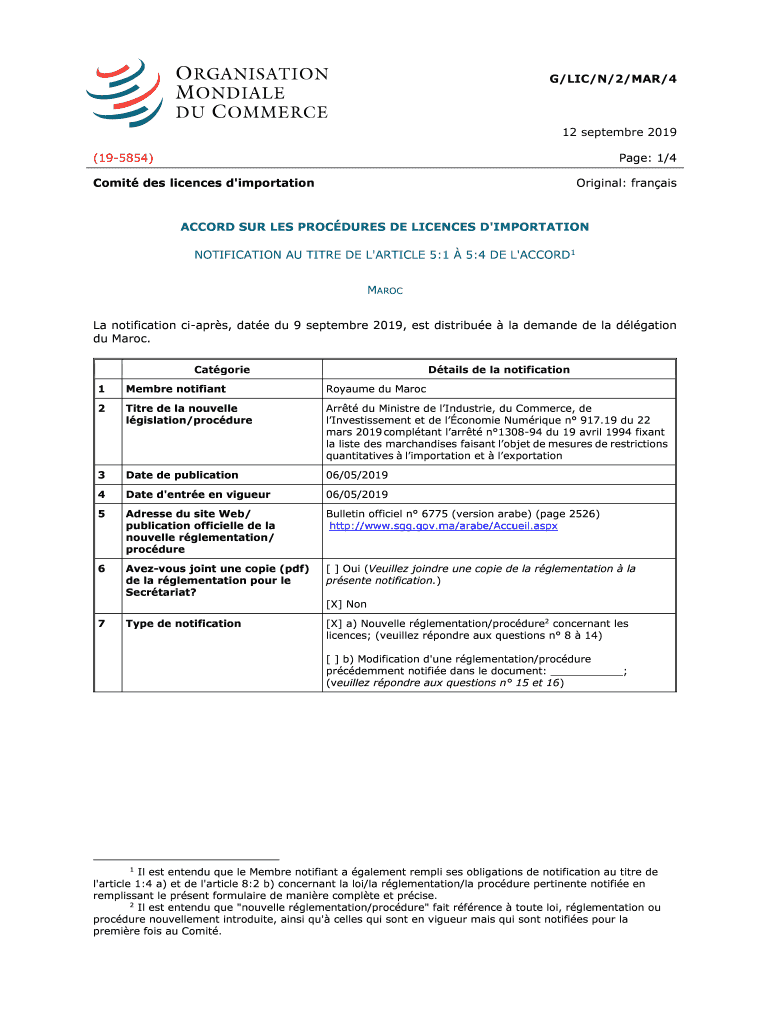 G/LIC/N/2/MAR/412 September 2019 (195854)Page: 1/4Comit DES licenses d 'importationOriginal: franaisACCORD SUR LES PROCEDURES DE Licenses D 'IMPORTATION NOTIFICATION AU TITLE DE L 'ARTICLE 5:1 5:4