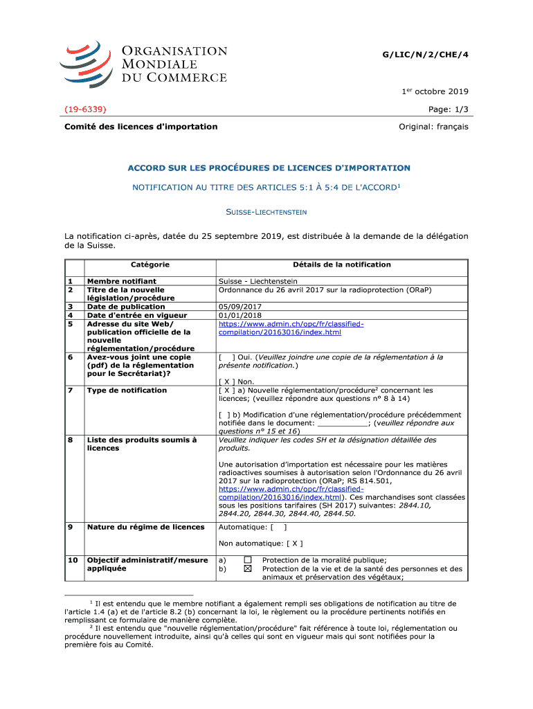 G/LIC/N/2/CHE/41er October 2019 (196339)Page: 1/3Comit DES licenses d 'importationOriginal: franaisACCORD SUR LES PROCEDURES DE Licenses D 'IMPORTATION NOTIFICATION AU TITLE DES ARTICLES 5:1 5:4 DE