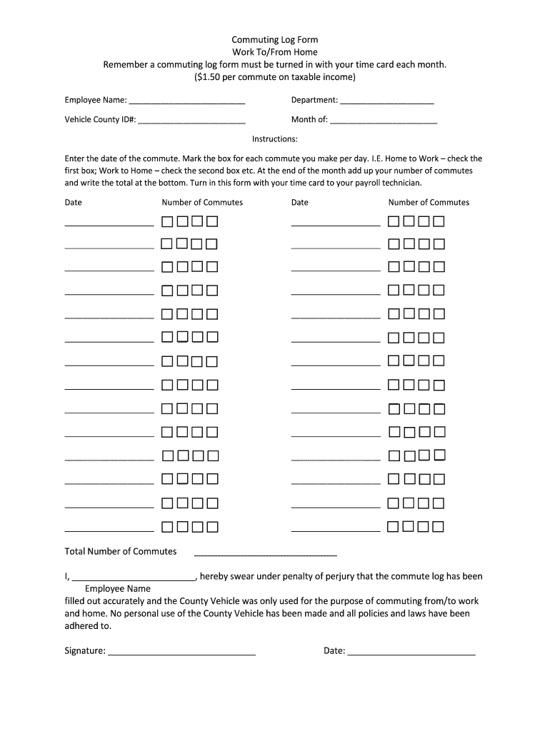 Commuting Log Form Work To/From Home Remember a commuting log form must be turned in with your time card each month. ($1.50 per commute on taxable income) Employee Name: Department: Vehicle County