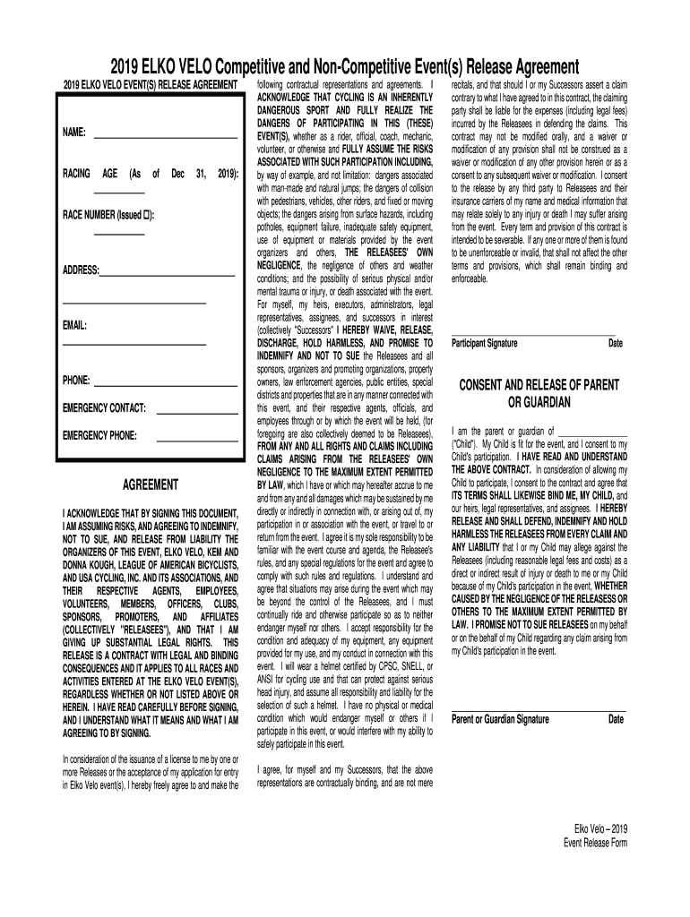 2019 ELK VETO Competitive and Noncompetitive Event(s) Release Agreement 2019 ELK VETO EVENT(S) RELEASE AGREEMENTNAME: RACING AGE (As ofDec31,2019):RACE NUMBER (Issued): ADDRESS: EMAIL: PHONE: EMERGENCY
