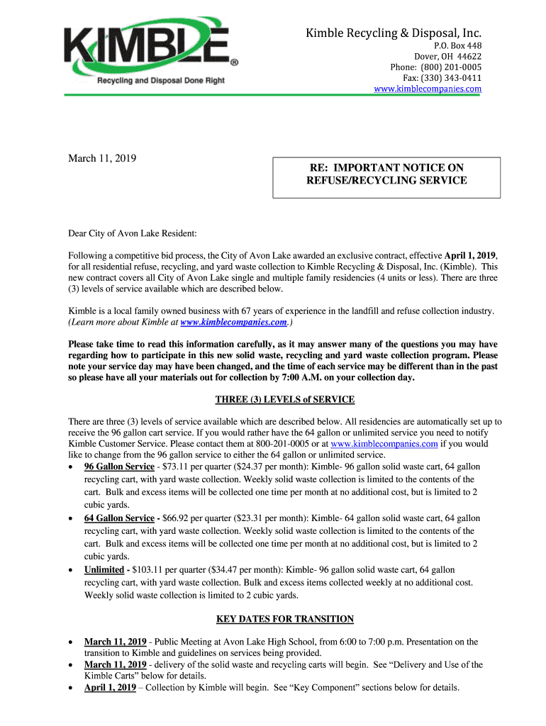 Nimble Recycling & Disposal, Inc. P.O. Box 448 Dover, OH 44622 Phone: (800) 2010005 Fax: (330) 3430411 www.kimblecompanies.comMarch 11, 2019RE: IMPORTANT NOTICE ON REFUSE/RECYCLING SERVICED ear City