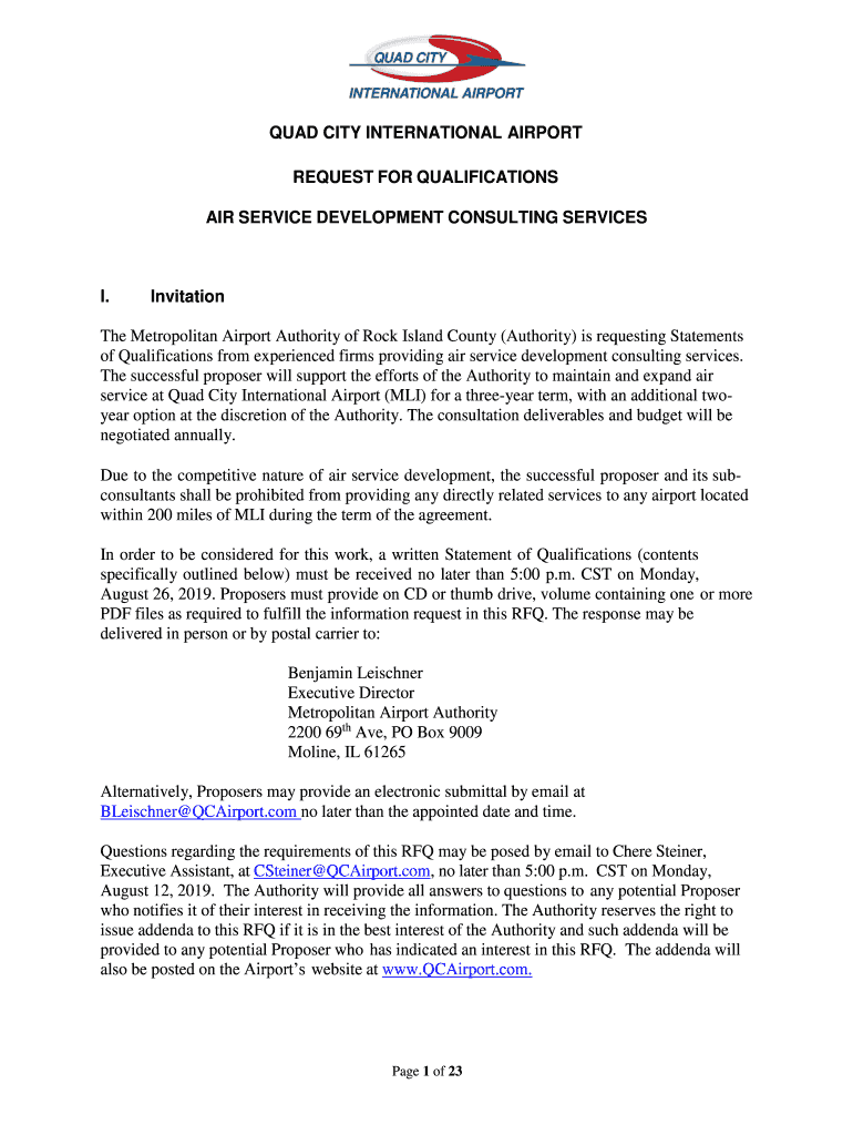 AIR SERVICE DEVELOPMENT CONSULTING SERVICES. Invitation Metropolitan Airport Authority of Rock Island County (Authority) is requesting Statements