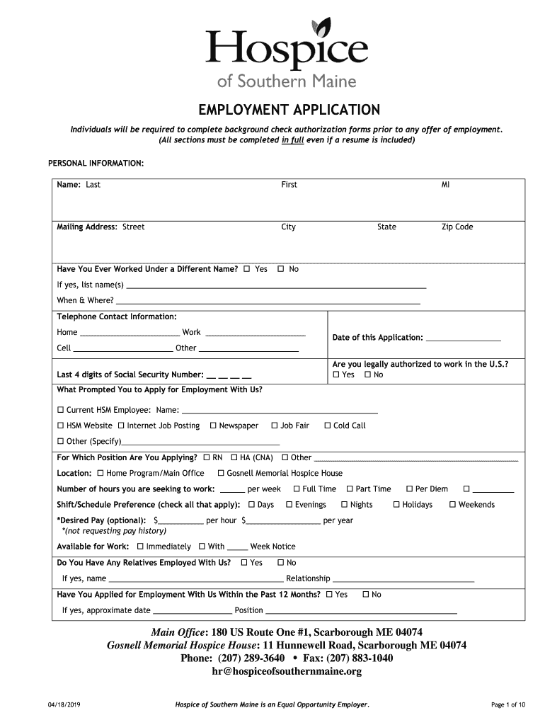 EMPLOYMENT APPLICATION Individuals will be required to complete background check authorization forms prior to any offer of employment. (All sections must be completed in full even if a resume is included)