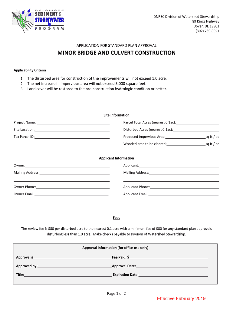 (302) 7399921APPLICATION FOR STANDARD PLAN APPROVALMINOR BRIDGE AND CULVERT CONSTRUCTION