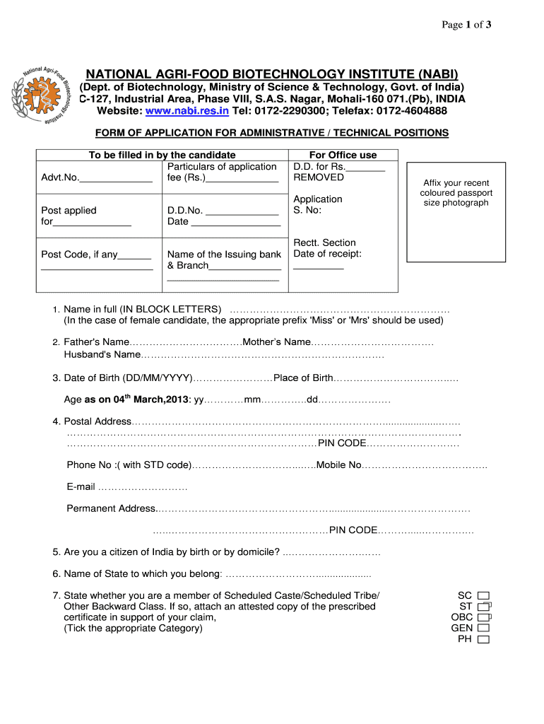 Page 1 of 3NATIONAL AGRI-FOOD BIOTECHNOLOGY INSTITUTE (NAZI) (Dept. of Biotechnology, Ministry of Science & Technology, Govt. of India) C127, Industrial Area, Phase VIII, S.A.S. Nagar, Mohali160 071.(Pb),