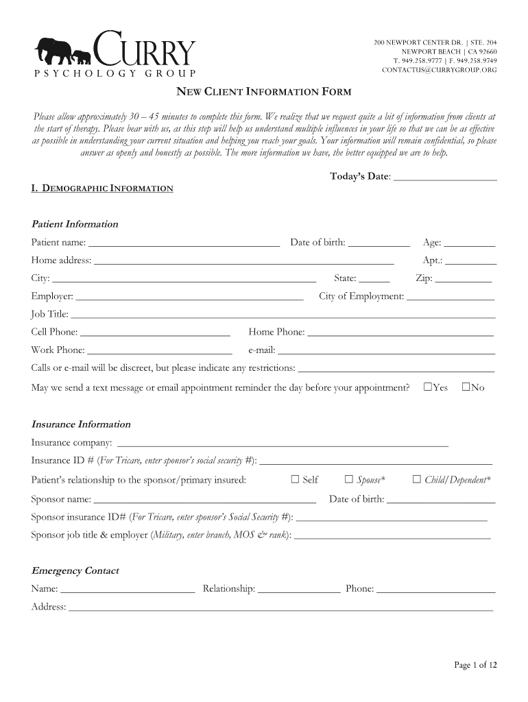 200 NEWPORT CENTER DR. STE. 204 NEWPORT BEACH CA 92660 T. 949.258.9777 F. 949.258.9749 CONTACTS CURRYGROUP.RENEW CLIENT INFORMATION FORM Please allow approximately 30 45 minutes to complete this form.