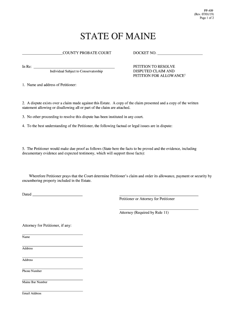 PP409 (Rev. 07/01/19) Page 1 of 2STATE OF MAINE COUNTY PROBATE COURTDOCKET NO. In Re: PETITION TO RESOLVE DISPUTED CLAIM AND PETITION FOR ALLOWANCE1Individual Subject to Conservatorship1. Name and