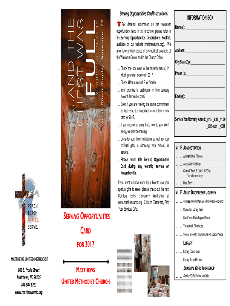 Serving Opportunities Card Instructions For detailed information on the volunteer opportunities listed in this brochure, please refer to the Serving Opportunities Descriptions Booklet, available on