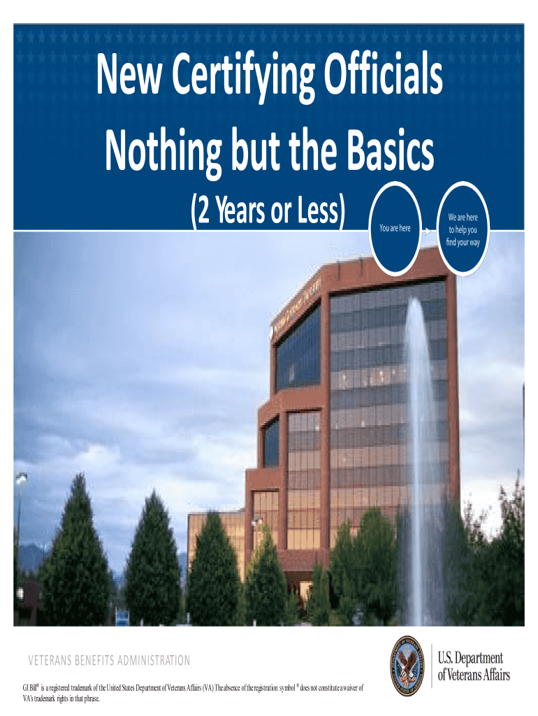 New Certifying Officials Nothing but the Basics (2 Years or Less)VETERANS BENEFITS ADMINISTRATION GI Bill is a registered trademark of the United States Department of Veterans Affairs (VA) The absence