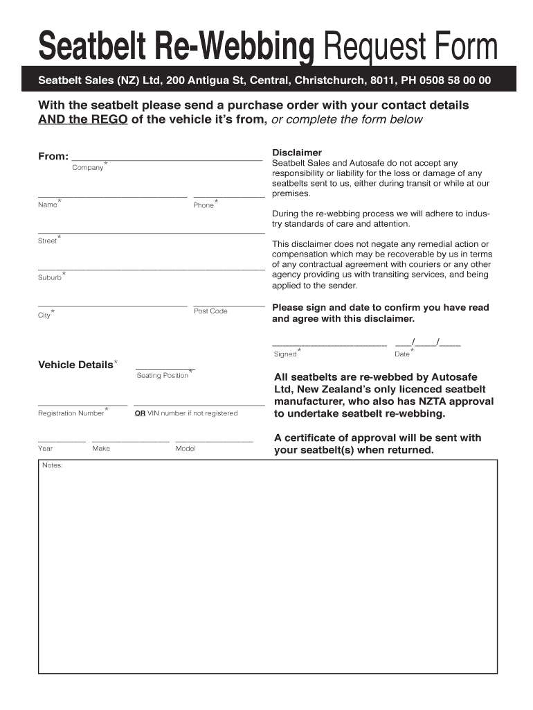 Seatbelt Webbing Request Form Seatbelt Sales (NZ) Ltd, 200 Antigua St, Central, Christchurch, 8011, PH 0508 58 00 00With the seatbelt please send a purchase order with your contact details AND the