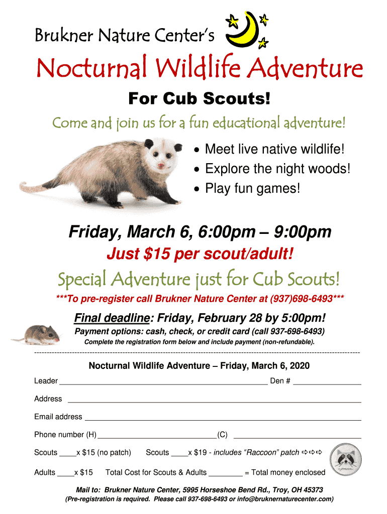 Bruckner Nature CentersNocturnal Wildlife Adventure For Cub Scouts! Come and join us for a fun educational adventure! Meet live native wildlife! Explore the night woods! Play fun games!Friday, March