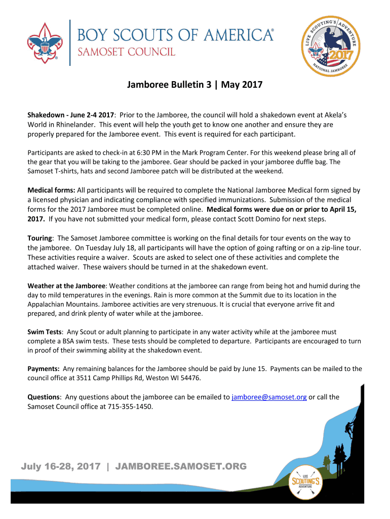 Jamboree Bulletin 3 May 2017 Shakedown June 24, 2017: Prior to the Jamboree, the council will hold a shakedown event at Areas World in Rhinelander. This event will help the youth get to know one another