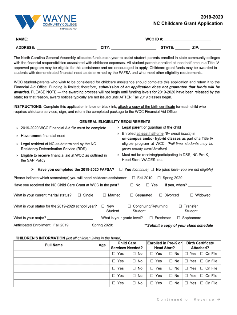 20192020 NC Childcare Grant Application NAME: ADDRESS: WCC ID #:CITY: STATE: ZIP: The North Carolina General Assembly allocates funds each year to assist student parents enrolled in state community
