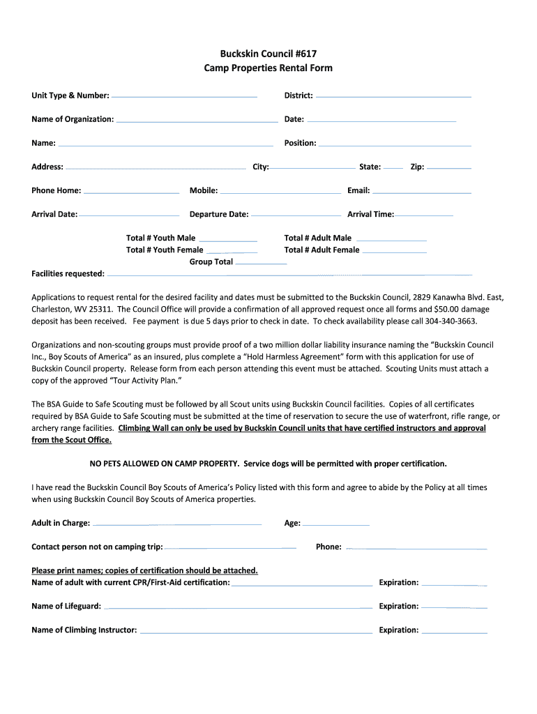 Buckskin Council #617 Camp Properties Rental Form Unit Type & Number:District:Name of Organization:Date:Name:Position:Address:City:State:Phone Home:Mobile:Email:Arrival Date:Departure Date:Arrival
