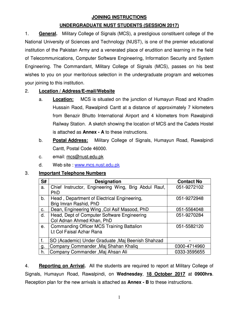 1. General. Military College of Signals (MCS), a prestigious constituent college of national University of Sciences and Technology (MUST),