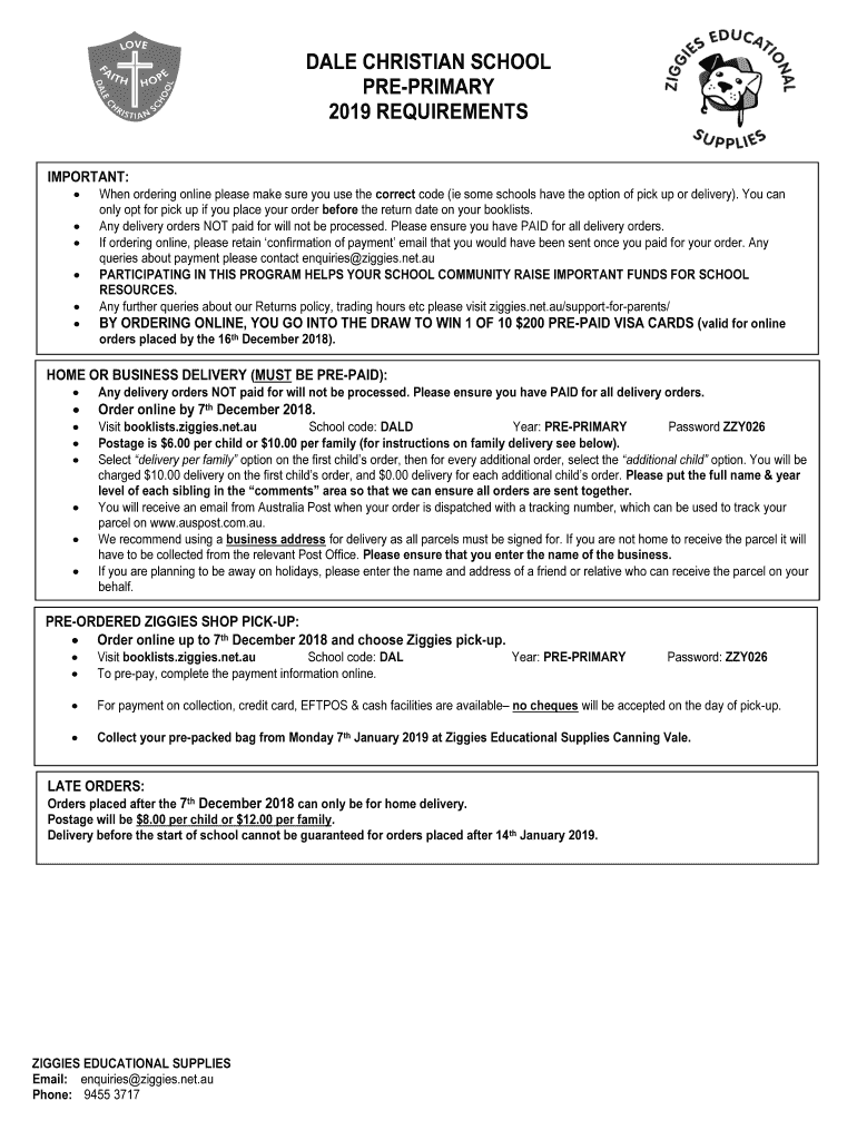 DALE CHRISTIAN SCHOOL PREPRIMARY 2019 REQUIREMENTS IMPORTANT: When ordering online please make sure you use the correct code (i.e. some schools have the option of pickup or delivery). You can only