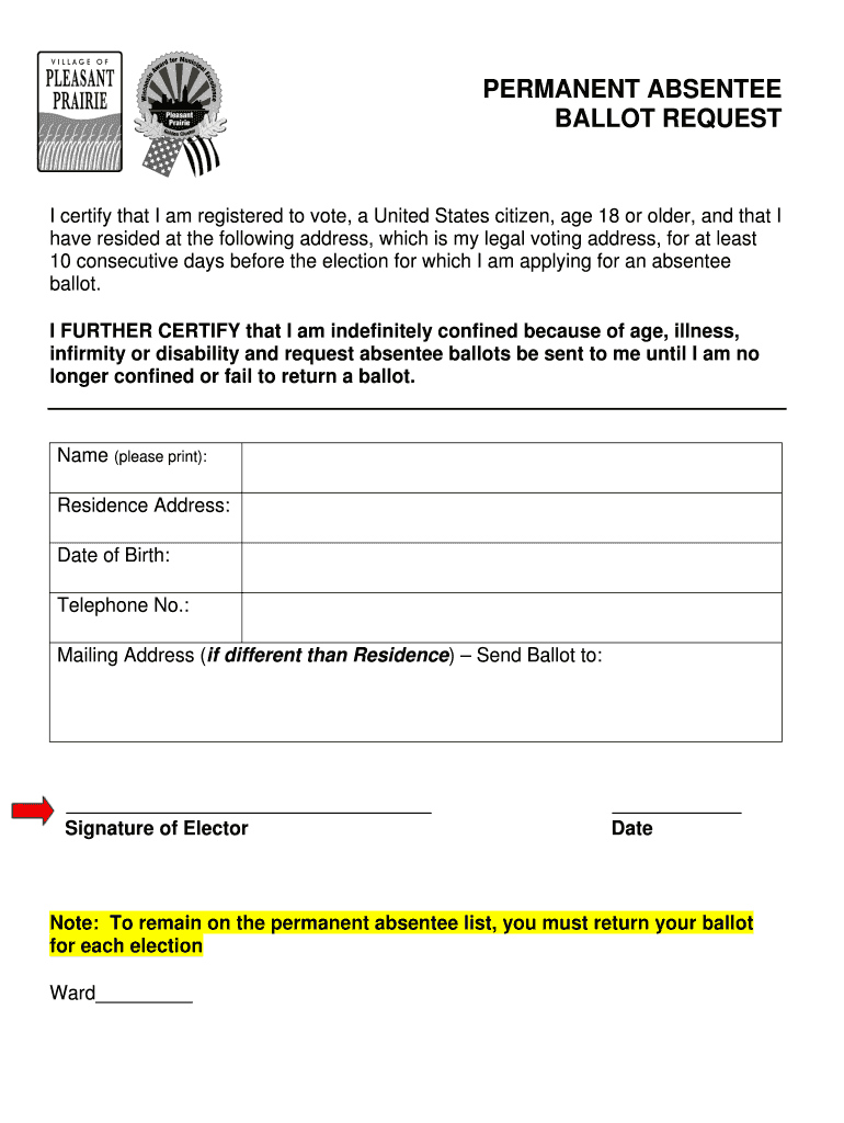 To fill out an absentee ballot application permanent, the voter must provide their personal information, including name, address, and signature, and indicate their desire to receive absentee ballots for all future elections.