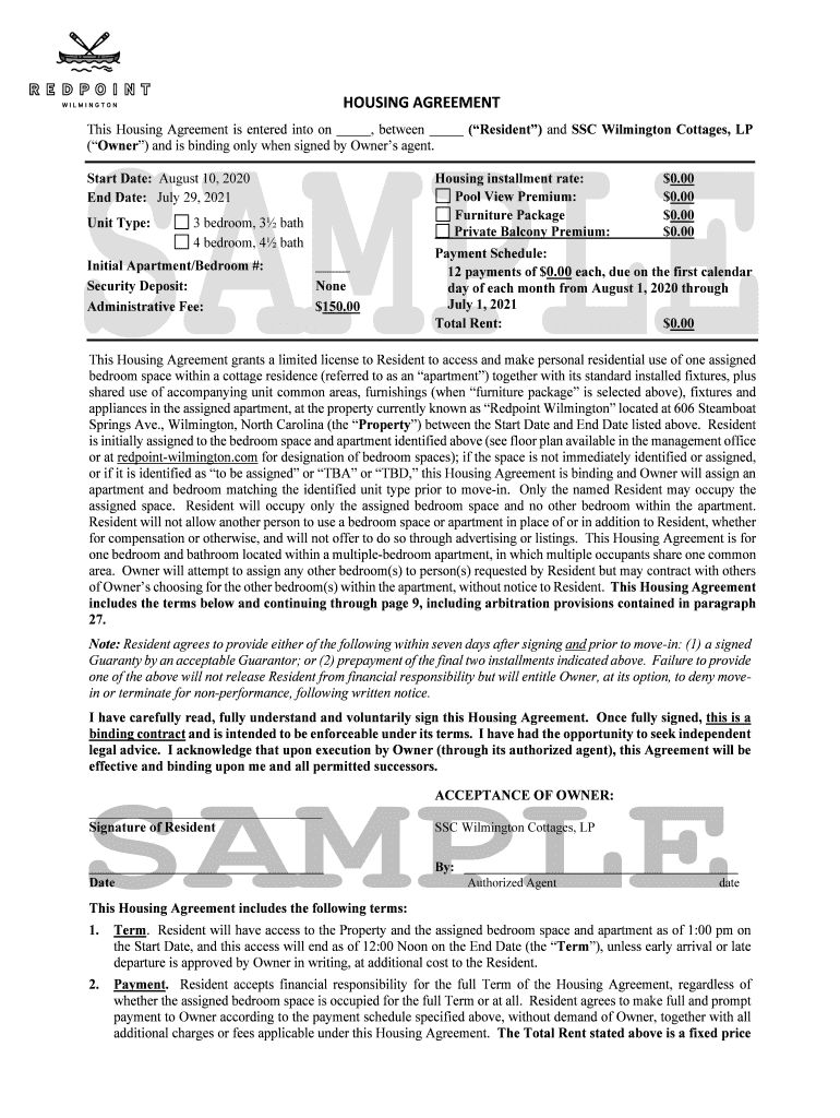 (Owner) and is binding only when signed by Owners agent. Housing installment rate: