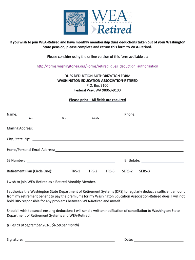 IfyouwishtojoinWEARetiredandhavemonthlymembershipduesdeductionstakenoutofyourWashington State pension, pleasecompleteandreturnthisformtoWEARetired. Pleaseconsiderusingtheonlineversionofthisformavailableat: