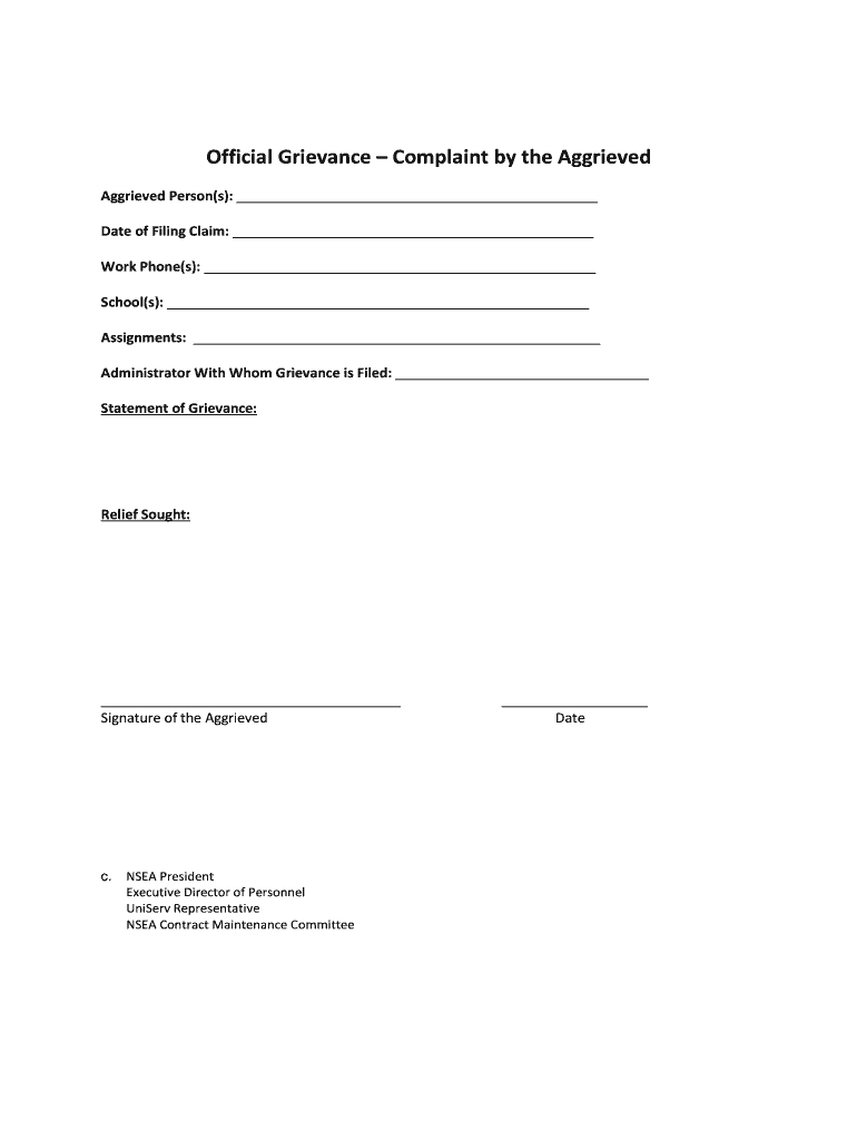 Official Grievance Complaint by the Aggrieved Person(s): Date of Filing Claim: Work Phone(s): School(s): Assignments: Administrator With Whom Grievance is Filed: Statement of Grievance:Relief Sought: