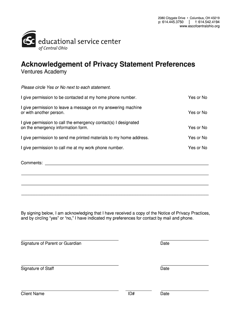 2080 City gate Drive Columbus, OH 43219p: 614.445.3750 f: 614.542.4194 www.escofcentralohio.orgAcknowledgement of Privacy Statement Preferences Ventures Academy Please circle Yes or No next to each