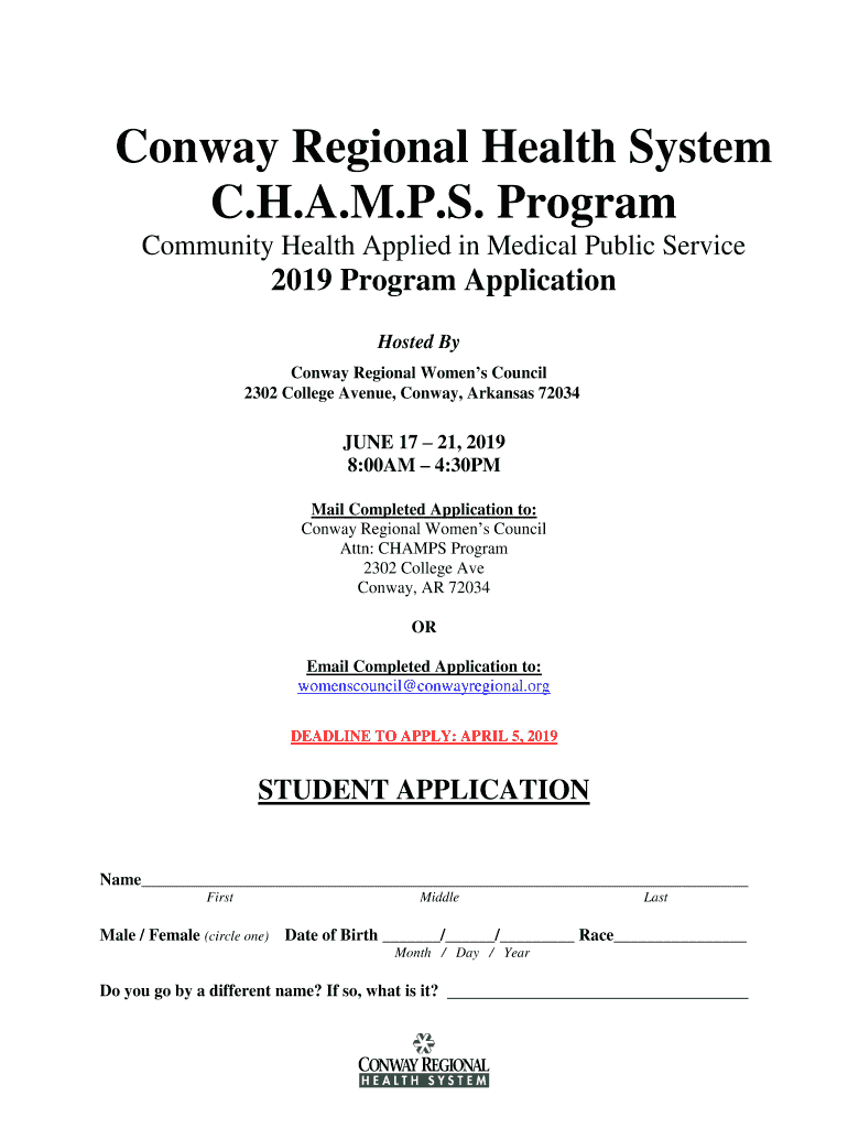Conway Regional Health System C.H.A.M.P.S. Program Community Health Applied in Medical Public Service2019 Program Application Hosted By Conway Regional Women's Council 2302 College Avenue, Conway,