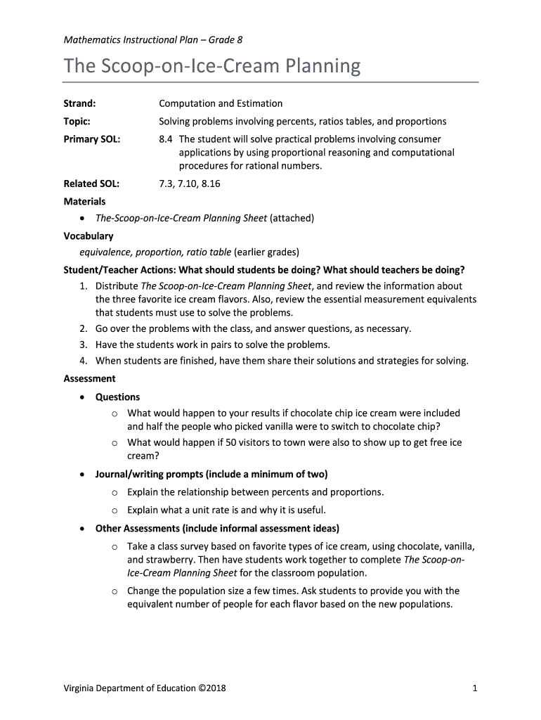 Mathematics Instructional Plan Grade 8The ScooponIceCream Planning Strand:Computation and EstimationTopic:Solving problems involving percents, ratios tables, and proportionsPrimary SOL:8.4 The student